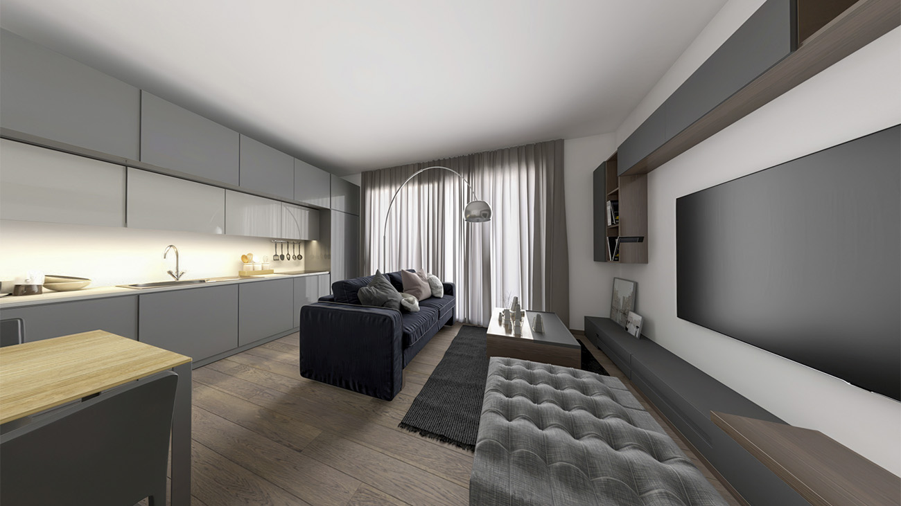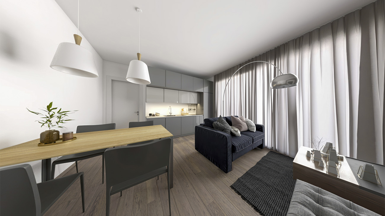 Bilocale composto da: soggiorno, cucina a vista, disimpegno, camera da letto, un bagno, terrazzo, cantina. DisponibilitĂ box auto.
