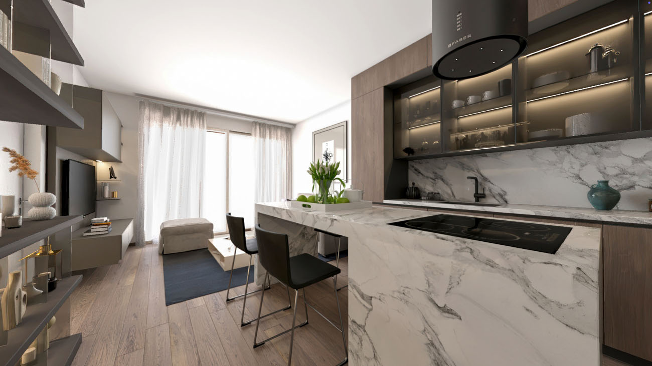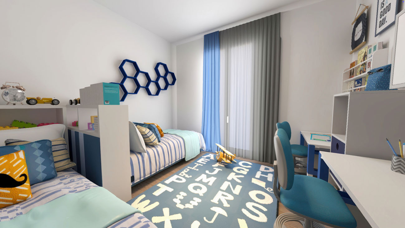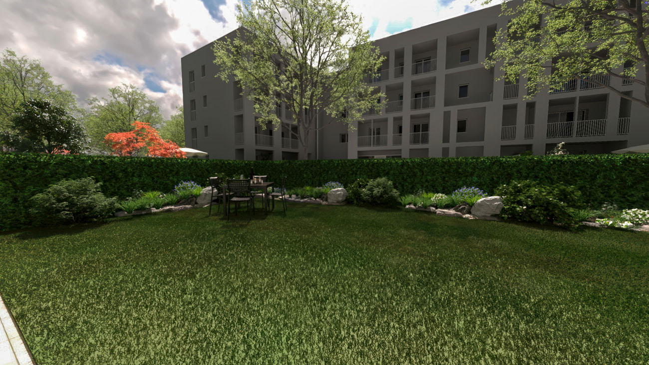 Quadrilocale composto da: soggiorno, cucina a vista, due disimpegni, camera da letto, due camerette, due bagni, giardino privato e cantina. DisponibilitĂ  box auto.