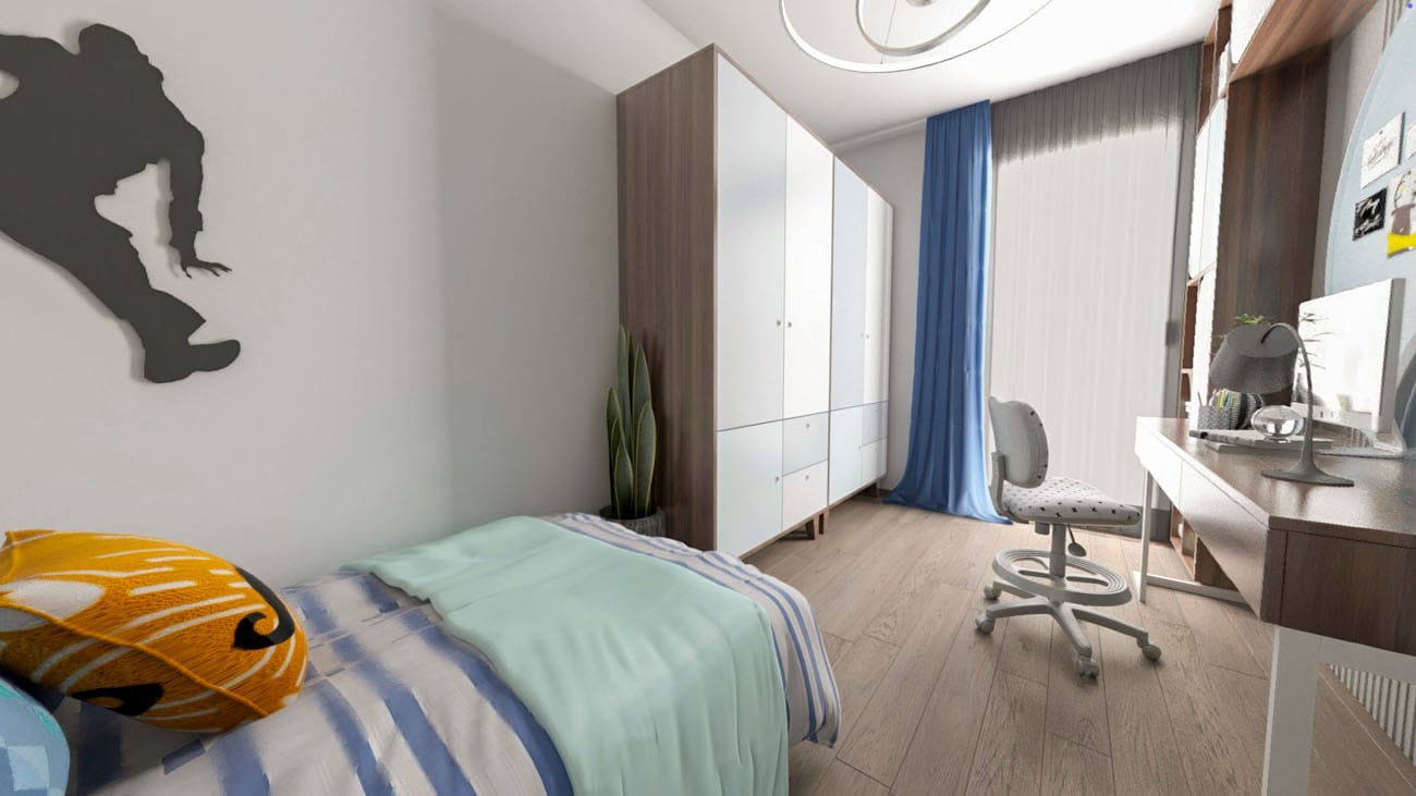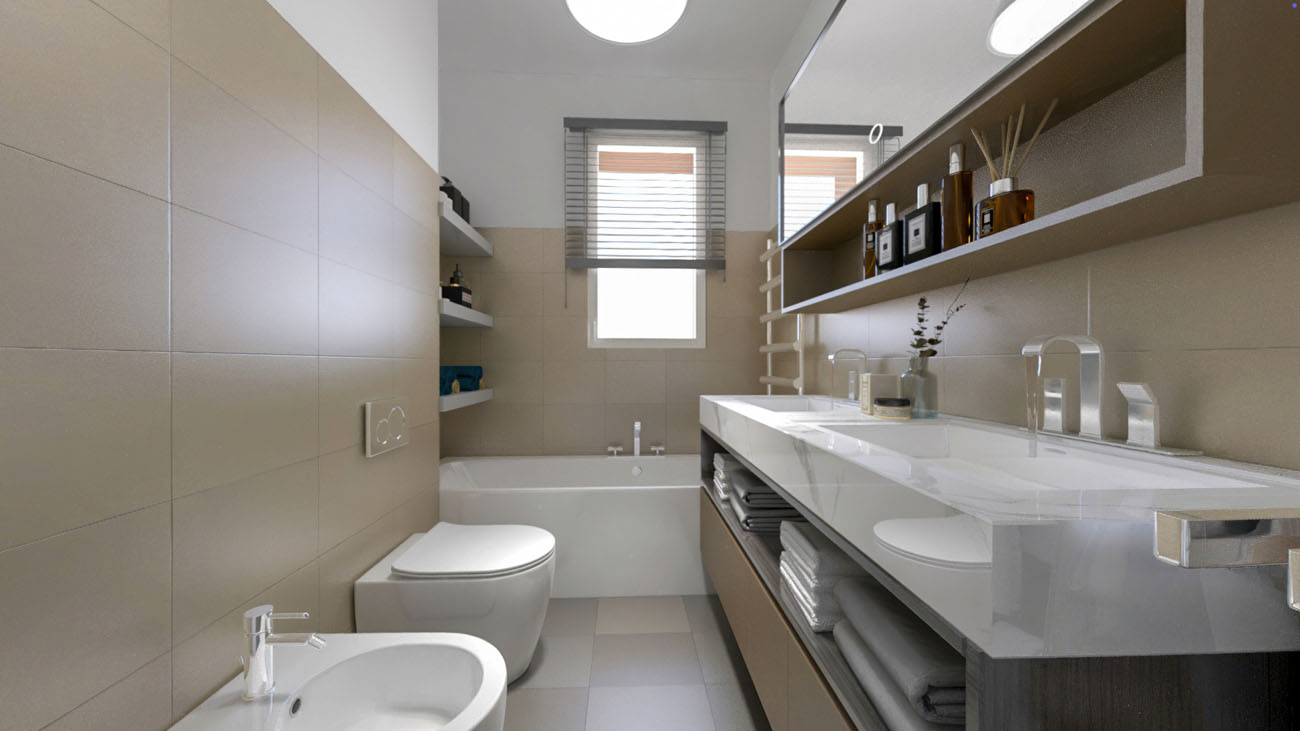Trilocale composto da: soggiorno, cucina abitabile, antibagno, disimpegno, camera da letto, cameretta, due bagni, terrazzo, cantina. DisponibilitĂ box auto.