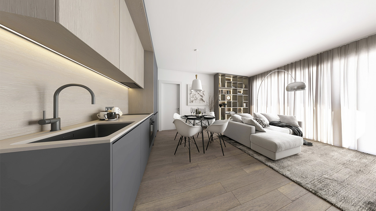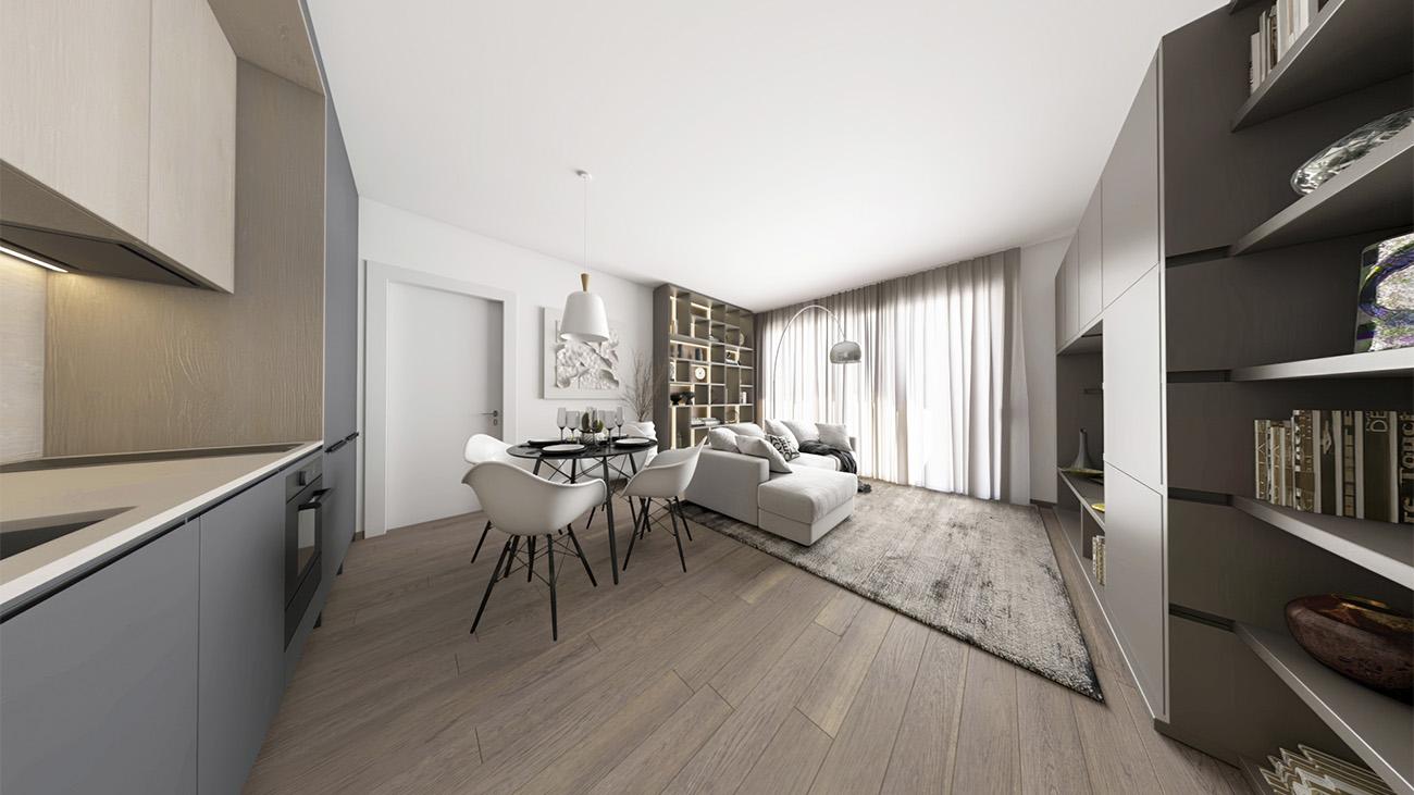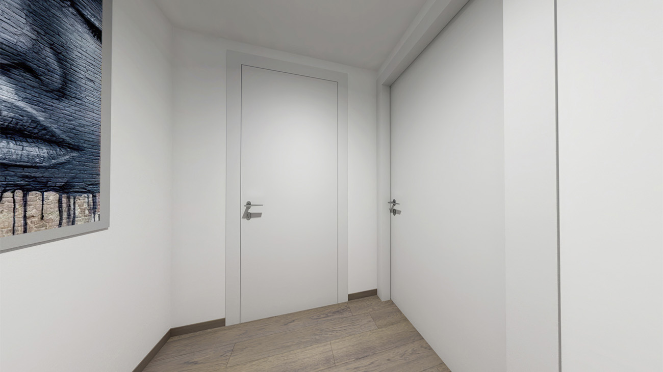 Bilocale composto da: soggiorno, cucina a vista, disimpegno, camera da letto, un bagno, giardino privato e cantina. DisponibilitĂ box auto.