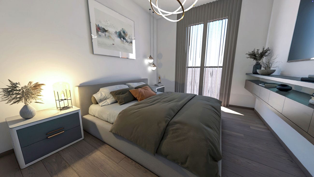 Bilocale composto da: soggiorno, cucina a vista, disimpegno, camera da letto con cabina armadio, un bagno, terrazzo, cantina. DisponibilitĂ box auto.