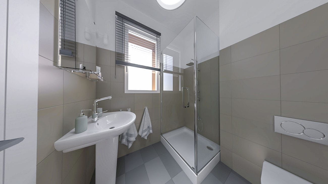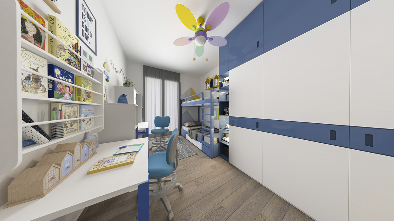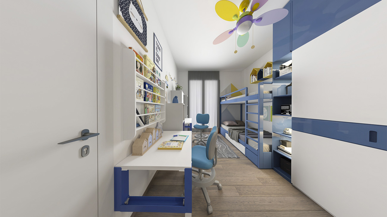 Trilocale composto da: soggiorno, cucina abitabile, disimpegno, camera da letto con cabina armadio, cameretta, due bagni, terrazzo e cantina. DisponibilitĂ box auto.