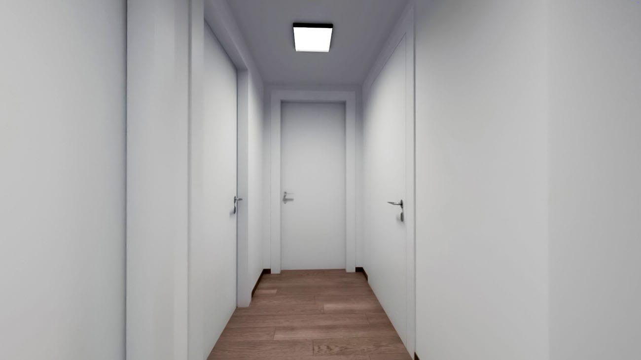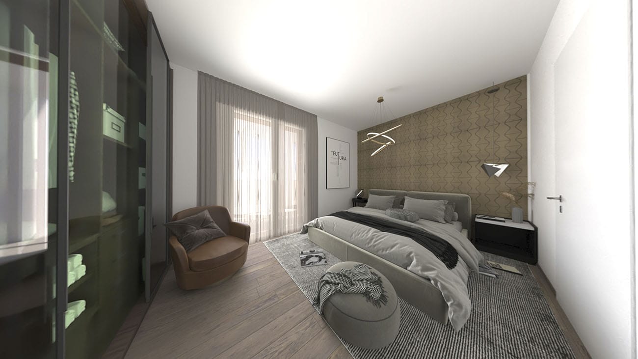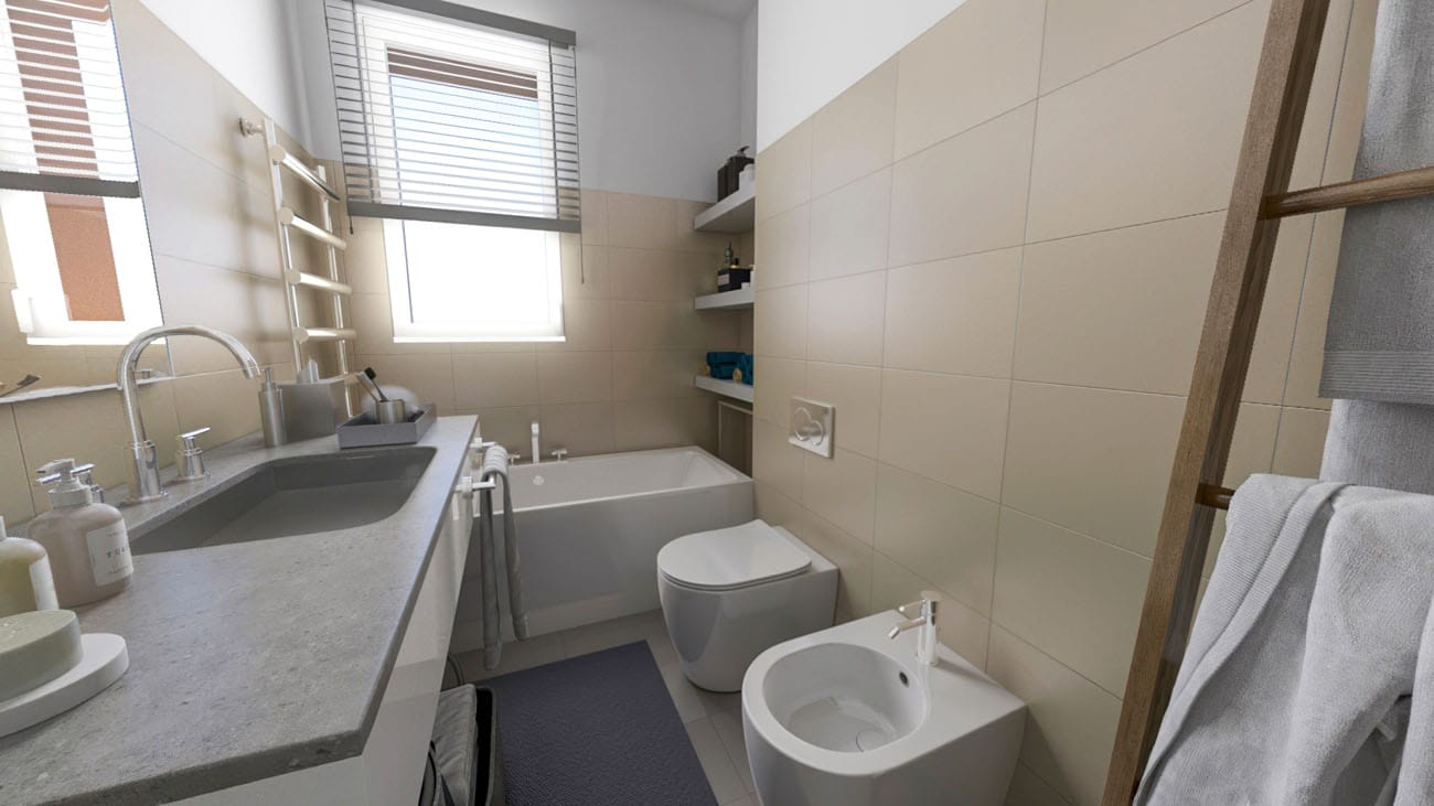 Trilocale composto da: soggiorno, cucina abitabile, disimpegno e ripostiglio, camera da letto, cameretta, due bagni, giardino privato e cantina. DisponibilitĂ box auto.